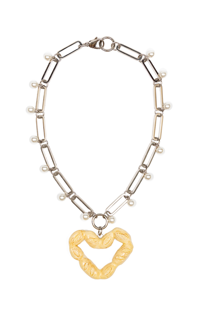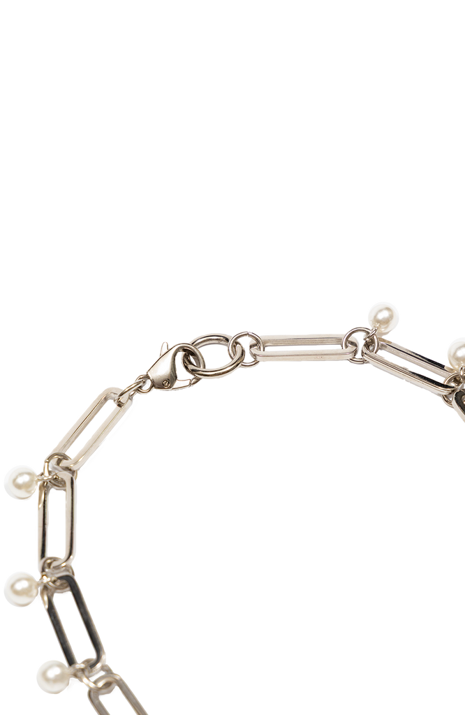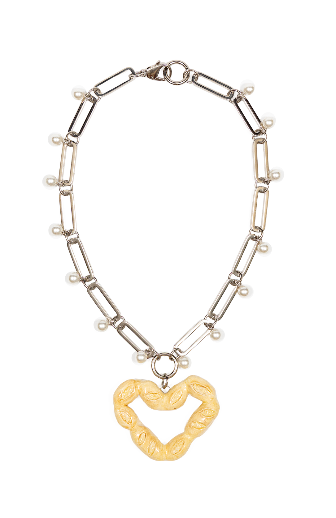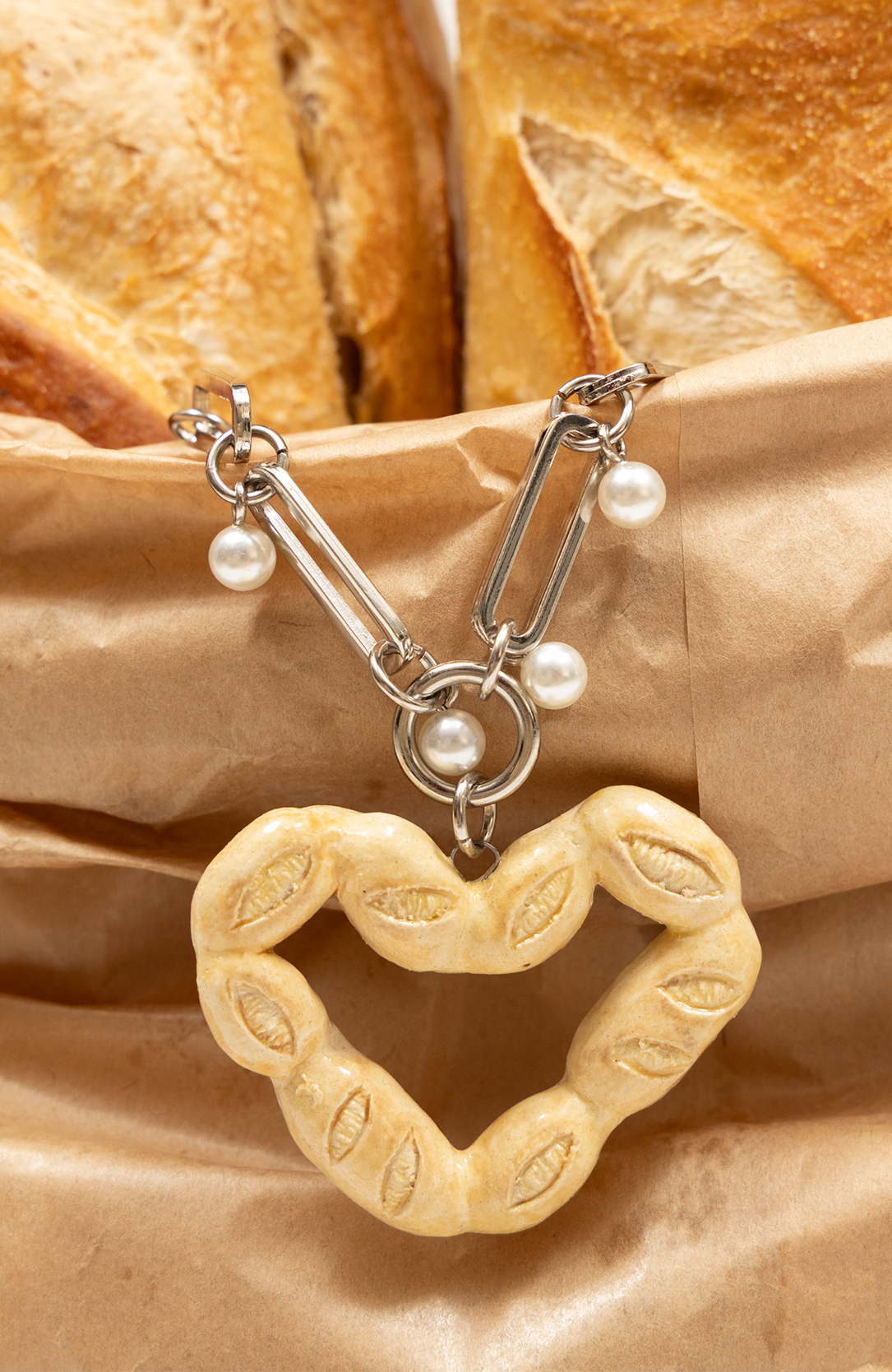 Feito com corrente com banho prata, detalhes de mini pérolas e pingente de cerâmica modelado à mão.