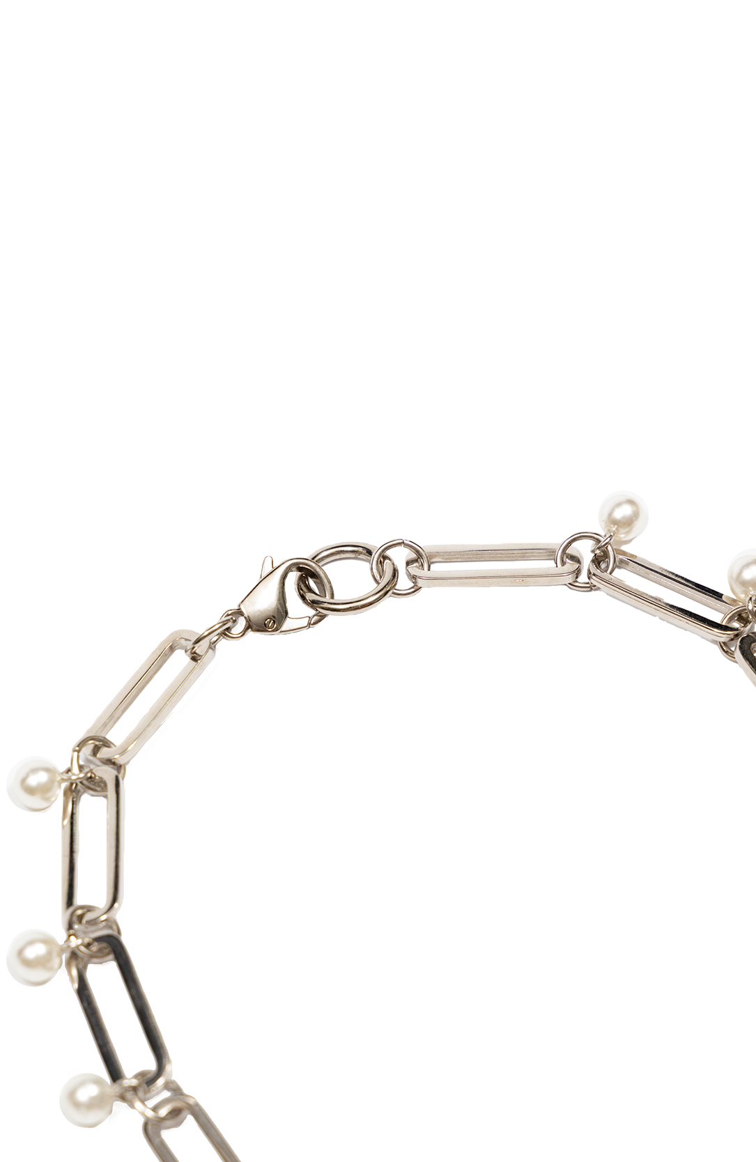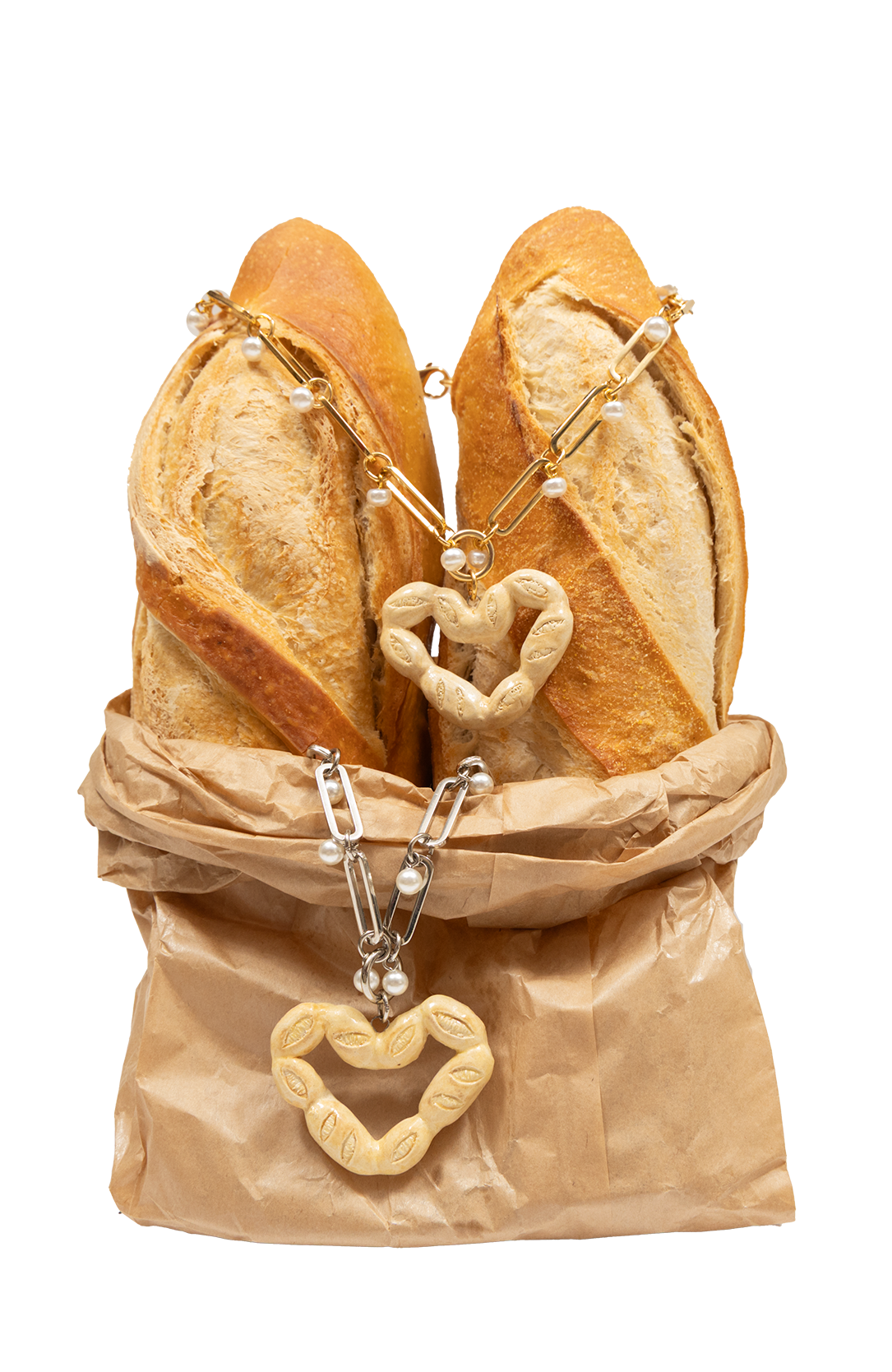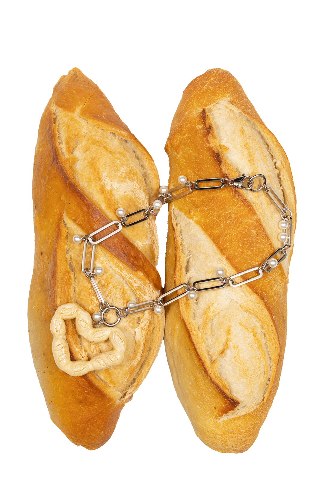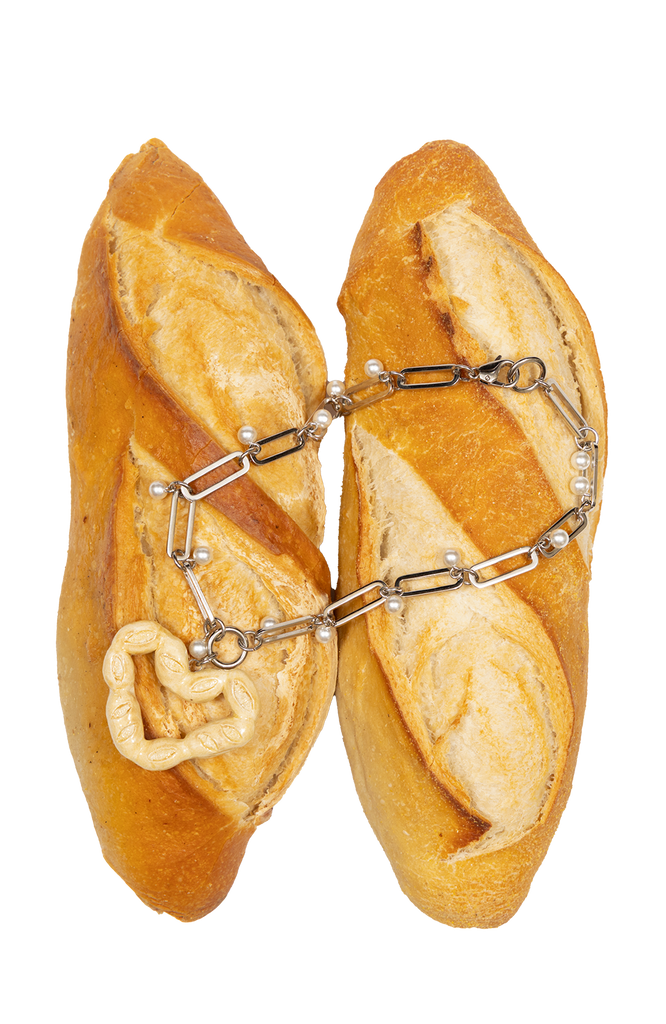 Feito com corrente com banho prata, detalhes de mini pérolas e pingente de cerâmica modelado à mão.